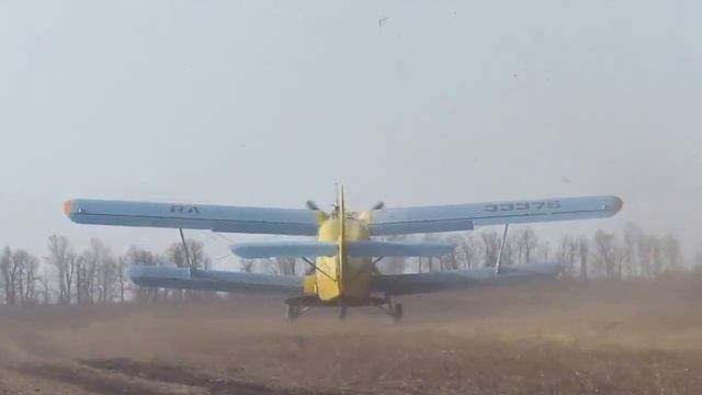 Самолёт АН-2 ведёт подкормку озимых культур минеральными удобрениями. Техника работает при предельно допустимой скорости бокового ветра. После разбрасывания удобрений проводилось боронование посевов тракторами МТЗ-82, ДТ-75 и МТЗ-1221.