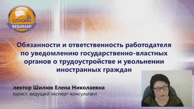 05.06.2023 Вебинар "Обязанности и ответственность работодателя по уведомлению государственно-властных органов при трудоустройстве и увольнении иностранных граждан" (Лектор Шилюк Е.Н.)