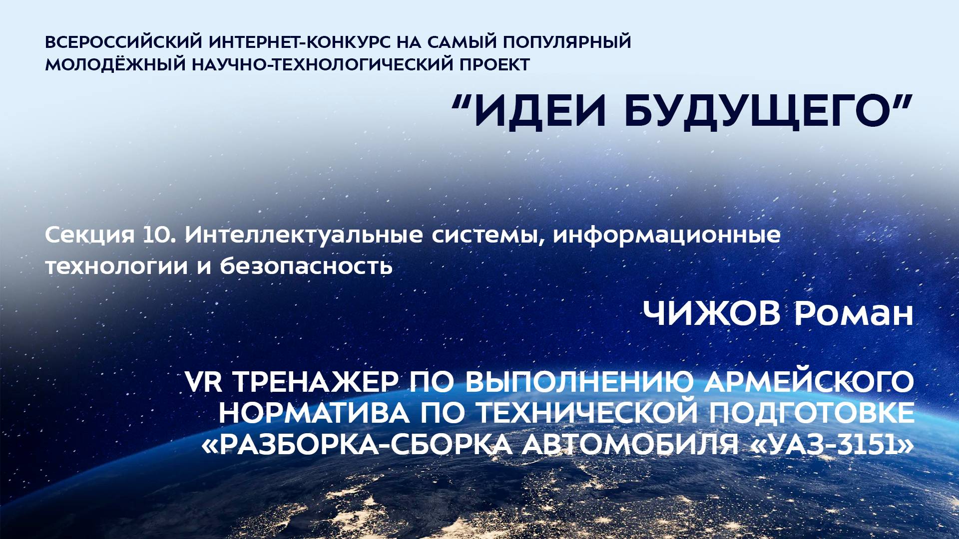 (10-9) ЧИЖОВ Роман Павлович Костромская область, г. Кострома Структурное подразделение Детский технопарк «Кванториум» ГБУ ДО КО «ЦТТ», 11 класс VR ТРЕНАЖЕР ПО ВЫПОЛНЕНИЮ АРМЕЙСКОГО НОРМАТИВА ПО ТЕХНИЧЕСКОЙ ПОДГОТОВКЕ «РАЗБОРКА-СБОРКА АВТОМОБИЛЯ «УАЗ-3151» Научный руководитель: Шестаков Александр Александрович, Костромская область, г. Кострома, Структурное подразделение Детский технопарк «Кванториум» ГБУ ДО КО «ЦТТ», педагог дополнительного образования высшей квалификационной категории Более подробно о мероприятиях Программы "Шаг в будущее" можно узнать на сайтах http://www.step-into-the-future.ru/ и http://шагвбудущее.рф Мероприятия проводятся при поддержке Фонда президентских грантов