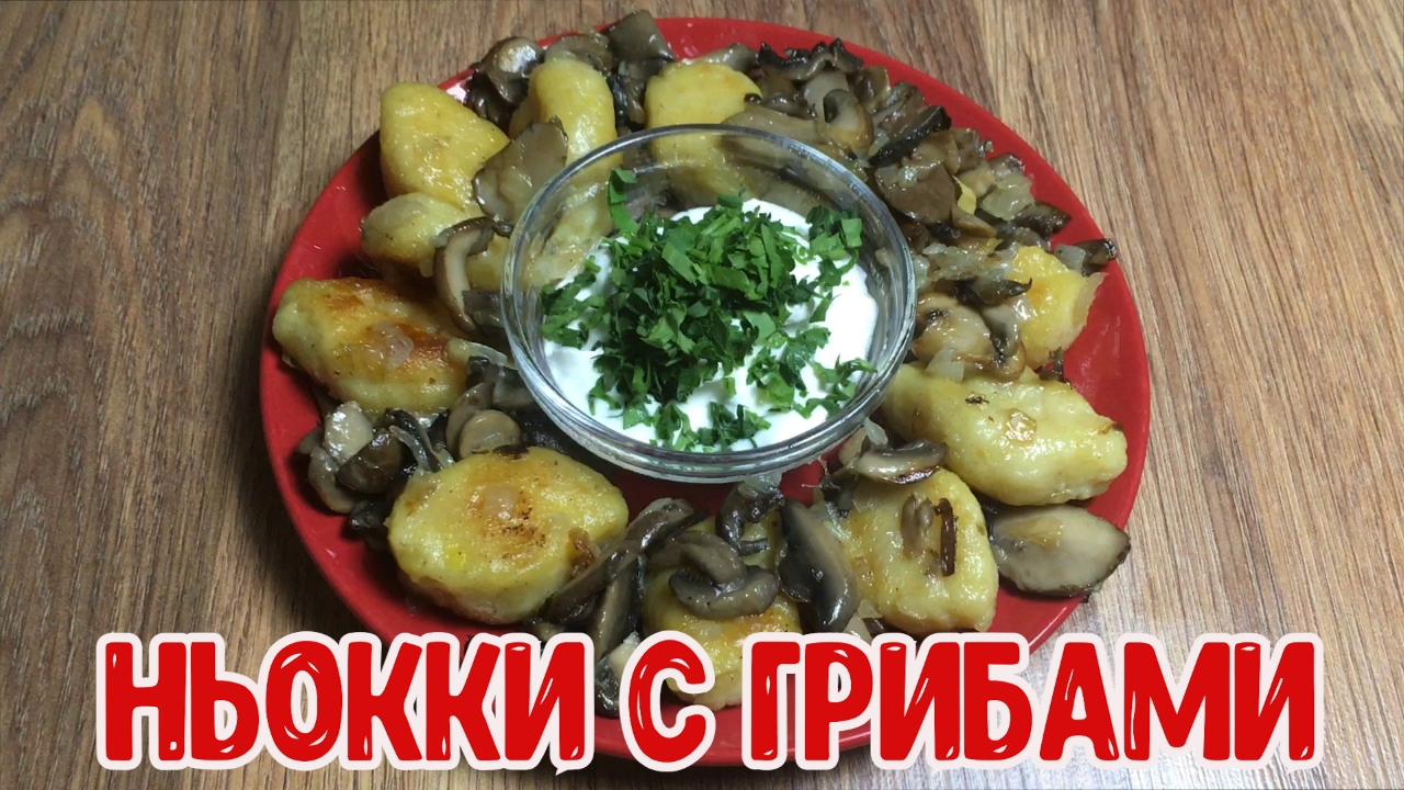 ИНГРЕДИЕНТЫ: Картофель – 1 кг. Яйцо куриное - 1 шт. Мука – 350 гр. Соль, перец, специи - по вкусу Растительное масло – для жарки Лук -1 шт. Грибы – 200 гр. РЕЦЕПТ: Отвариваем картофель в мундире. Вареный картофель, очищаем, разминаем в пюре. Смешиваем с яйцом. Из получившегося пюре, начинаем замешивать тесто, постепенно добавляя муку в процессе. Должно получиться нежное тесто, не прилипающее к рукам. Готовое тесто, разделяем на несколько частей, и формируем из них длинные колбаски. Колбаски затем нарезаем на небольшие кусочки одинаковой величины (примерно 3 см.) Скатываем из них шарики и слегка сплющиваем. Ставим на плиту воду, доводим до кипения, солим. Высыпаем туда ньокки. Помешиваем, пока не всплывут на поверхность воды. Режем грибы и лук, обжариваем на сливочном масле. Когда грибы дойдут о полуготовности, выкладываем их в миску, а на этой сковороде, вылавливаем ньокки и обжариваем. По 2-3 минуты с каждой стороны, до появления золотистой корочки. Когда ньокки поджарятся, добавляем грибы и жарим еще 3 минуты. Можно подавать со сметаной или другими соусами! Приятного аппетита!!!