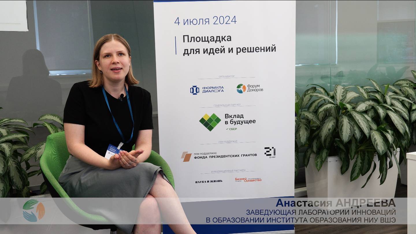 Анастасия Андреева, заведующая Лаборатории инноваций в образовании Института образования НИУ ВШЭ и програмный директор Конкурса инноваций в образовании (КИвО), на Форуме «Формула диалога» рассказала о проектах и партнерстве в сфере образования Форум Доноров https://www.donorsforum.ru/ Формула Диалога https://formula.donorsforum.ru/ Андреева Анастасия Александровна https://www.hse.ru/org/persons/101504422 Конкурса инноваций в образовании (КИвО) https://kivo.hse.ru/ Благотворительный фонд Сбербанка «Вклад в будущее» — Генеральный партнёр Форума. Проект «Формула Диалога» реализуется Форумом Доноров при поддержке Фонда президентских грантов.