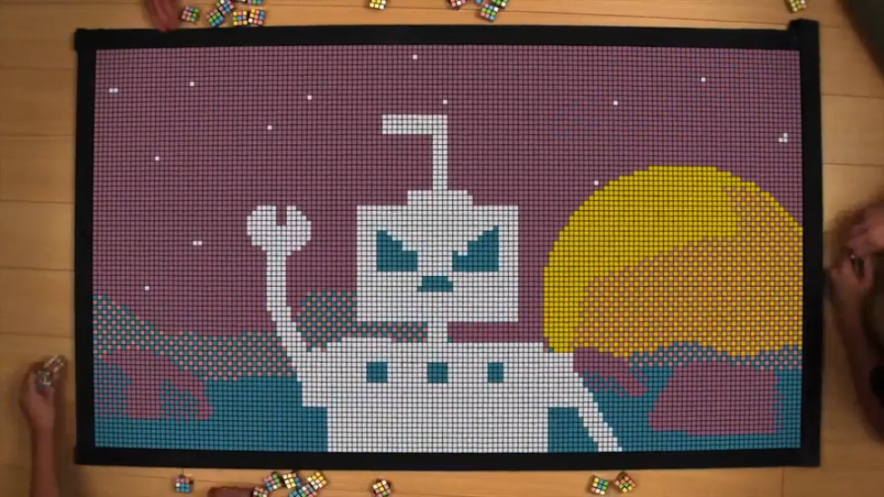 Эта анимация сделана из кубиков Рубика. В ней было использовано 1296 мини-кубиков Рубика, а количество перестановок кубиков - 961 раз.