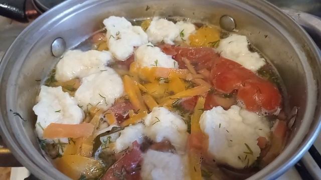 Бульон с клёцками.Куриное отварное мясо.Салат из овощей.Подсушенная булочка.Чай с лимоном.
