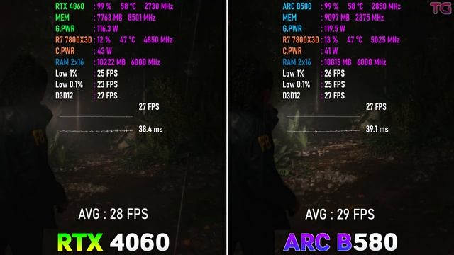 GeForce RTX 4060 8GB vs Intel ARC B580 12GB l 1440p Buy games at the best prices on gamivo.com - https://gvo.deals/TestingGames Use coupon code and get discount - TG3 Ad - 0:00 Games : Horizon Forbidden West - 0:09 Cyberpunk 2077 - 1:10 Cyberpunk 2077 | RT - 2:18 S.T.A.L.K.E.R. 2 - 3:27 Ghost of Tsushima - 4:33 Alan Wake 2 - 5:26 God of War: Ragnarök - 6:27 SILENT HILL 2 - 7:21 Senua's Saga - Hellblade II - 8:13 Starfield - 9:06 Forza Horizon 5 - 10:20 System: Windows 11 Ryzen 7 7800X3D - http://bit.ly/43e3VxW MSI MPG X670E CARBON - https://bit.ly/3YWS871 RAM 32GB DDR5 6000MHz CL30 - https://bit.ly/4e3MqEG Intel ARC B580 12GB - https://bit.ly/3OSOhCp GeForce RTX 4060 8GB - https://bit.ly/3CRMGqh SSD - 2xSAMSUNG 970 EVO M.2 2280 1TB - https://bit.ly/2NmWeQe Power Supply CORSAIR RM850i 850W - https://bit.ly/3i2VoGI Теги: RTX 4060 vs ARC B580,RTX 4060,ARC B580,intel arc,b580,arc b580 vs rtx 4060,b580 vs 4060,4060 vs b580,intel gpu,nvidia vs intel,arc b580 gaming,8gb vs 12gb,4060 1440p,arc b580 1440p,Cyberpunk 2077,stalker 2,fps,test