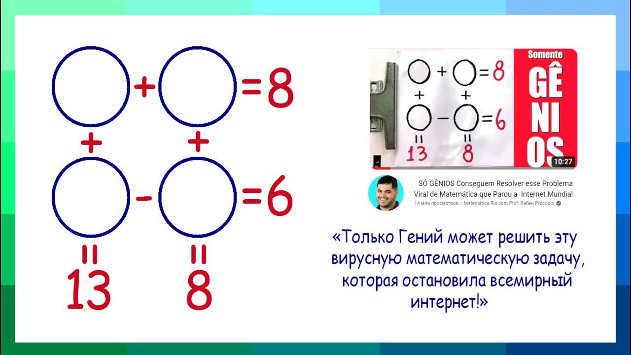 https://t.me/volkov_telegram Только Гений может решить эту вирусную математическую задачу, которая остановила всемирный интернет https://youtu.be/cjrBO6oF5Hk Найдите числа в каждом круге так, чтобы равенства были верны. Valery Volkov https://www.youtube.com/valeryvolkov Наш семейный канал: https://www.youtube.com/@arinablog Почта: uroki64@mail.ru