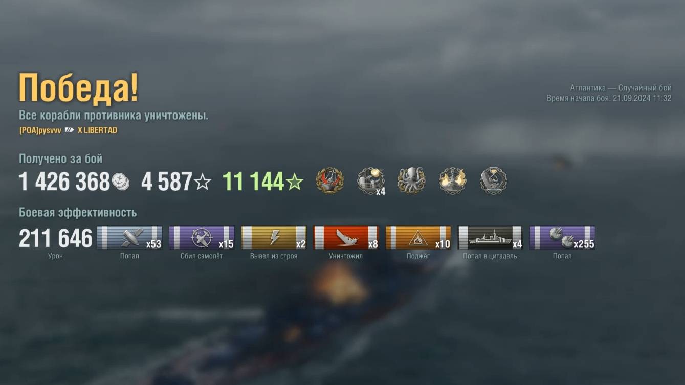 Линкор: Libertad Игрок: pysvvv (NA) Карта: Атлантика - Случайный бой Урон: 211к Libertad - Линкор Пан-Америка 10 уровня