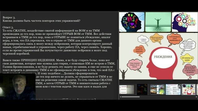 Вопрос 3. Какова должна быть частота повторов этих упражнений? Ответ 3. То есть СЖАТИЕ, воздействие сжатой информацией на ВОМ и на ТММ производим до тех пор, пока не произойдет ОТРЫВ ВОМ от ТММ. Все действия встраиваем в ТММ до тех пор, пока в ОТРЫВЕ не появиться убеждение, аналог веры, в том, что ПА укрепился, что в отрыве от ТММ для данного органа сформировалась связь в мозгу между нейронами, которая контролирует данный навык, отрабатываемый в упражнении, через работу ПА, через память. Хорошо, если во время упражнений Вы почувствуете движение нейронов в мозге под черепной коробкой. Важен также ПРИНЦИП НЕДЕЯНИЯ. Мама, я не буду стирать белье, пока все свои движения, которые мне нужны для стирки, с помощью КМ не встрою в ТММ, Галина Брониславовна, я не буду решать эту задачу по химии, я еще не успела ее текст встроить в динамику ТММ и не сформировала убеждение в том, что мой ПА с этой задачей справиться. И тому подобное… Должна сформироваться убежденность, как вера, до тех пор ничего не делать, не отрываться от ТММ и не концентрировать внимание на решении самой задачи. То есть сначала СЖАТИЕ информации и работа с ТММ, а затем ОТРЫВ от ТММ и внимательная работа с самим движущимся органом или с текстом задачи. Это как вдох и выдох для динамики ВОМ. Вопрос 4. Каков должен быть результат от упражнений? Как его фиксировать? Ответ 4. Я уже все это в подробном виде отсылал один раз на всероссийский конкурс педагогов, но меня обошли молчанием… Здесь скажу кратко: делаются таблицы, в них, на каждого ребенка в отдельности, фиксируются две вещи: 1. рост изо дня в день качества мышления, которое определяется как отношение удавшихся попыток что-либо сделать ко всем произведенным попыткам, помноженное на 100%; 2. рост мощности (в Ваттах) функционирования ПА познавательного аппарата ребенка, как отношение любой работы совершенной ребенком (в Джоулях) ко времени (в секундах); это тоже каждодневно фиксируется. 3. Труд учителя можно оплатить тогда, когда есть рост качества (в %) и мощности работы ПА (в Ваттах), то есть на лицо имеются данные о том, что ПА ребенка укрепляется и совершенствуется… Владимир Казакевич, исследователь волновой природы человека https://vk.com/vladimir_440 https://www.youtube.com/channel/UCikXnVVFrjs6EKqrltvrbzQ Почта для связи k_v_v_01@bk.ru