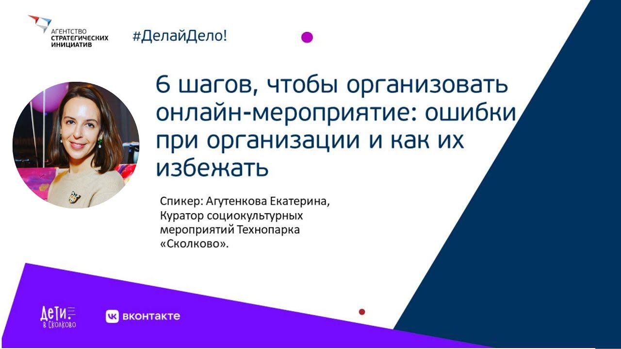 Спикер: Агутенкова Екатерина, Куратор социокультурных мероприятий Технопарка «Сколково». Во время лекции мы узнаем всё об управлении онлайн-мероприятими.