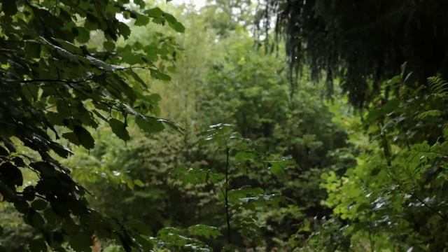 Капли дождя падают с деревьев. Тихие звуки дождя в летнем лесу.