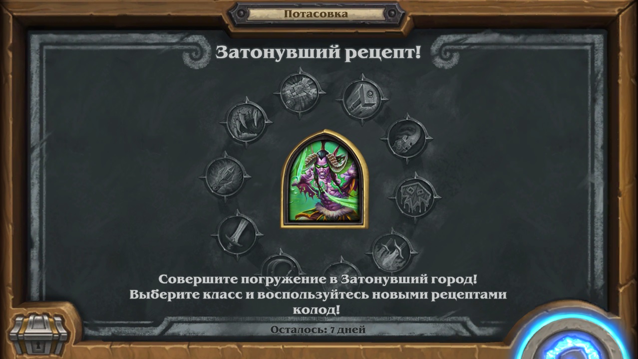 Потасовка в Hearthstone, в период с 13.04.2022 - 20.04.2022 Потасовка: Затонувший рецепт! Совершите погружение в Затонувший город! Выберете класс и воспользуйтесь новыми рецептами колод!