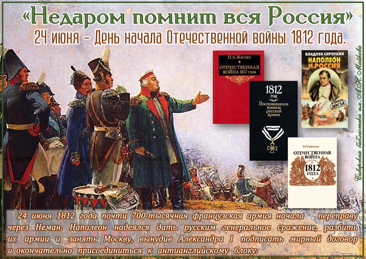 24 июня 1812 г. Армия Наполеона вторглась в Россию — началась Отечественная война 1812 года (12) 24 июня 1812 года армия французского императора Наполеона I без объявления войны вторглась в Россию — после полуночи по четырём наведённым мостам началась переправа французских войск через пограничный Неман. В 6 часов утра (12) 24 июня 1812 года авангард французских войск вошёл в российскую крепость Ковно. Неприятелю противостояла русская армия под командованием генералов М.Барклая-де-Толли, П.Багратиона и А.Тормасова. Быстрое продвижение французов вынудило русское командование отступить вглубь страны. Отступая, русские войска вели арьергардные бои, нанося противнику значительные потери. В ходе Смоленского сражения в начале августа был сорван план Наполеона о разгроме основных сил российских войск Мои контакты: Ютуб- https://www.youtube.com/channel/UC60YqkKksZaT2x-uLcUCCCg ВКонтакте- https://vk.com/oblinova1965 ОК- https://ok.ru/group/59523134783660/video/c4532140 Телеграм- https://web.telegram.org/a/#-1001443284231
