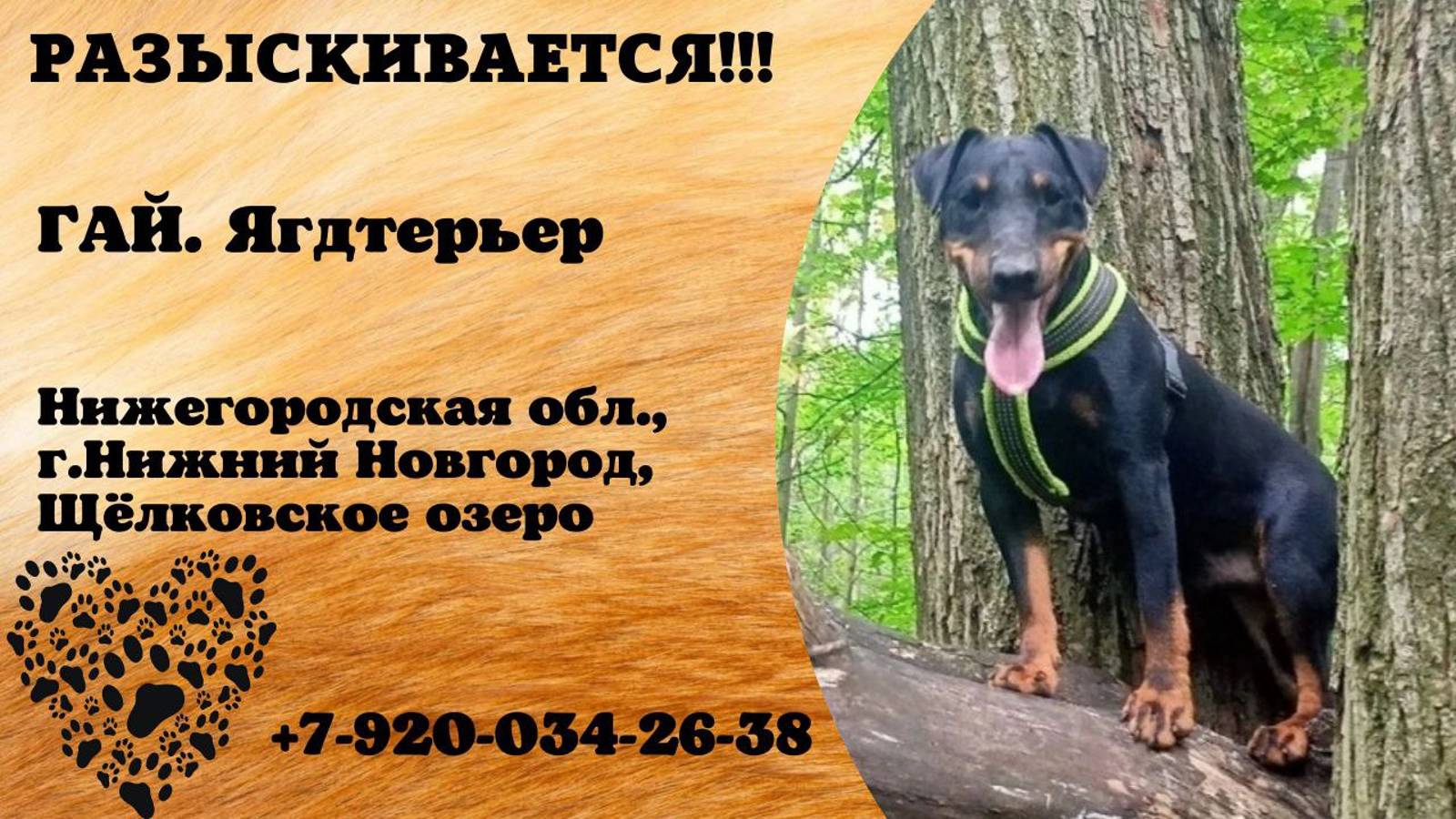 Нижегородская Нижний Новгород Пропала собака Пропал ягдтерьер, кобель, возраст 2 года, кличка Гай. Пропал в районе Щёлковского озера 13 сентября в районе 15.00. Особые приметы: был на красном коротком поводке и ошейнике с шипами чёрного цвета, также имелся адресный жетон с указанием клички и номером телефона. Видели что собаку кто-то увёл с собой. Если у кого есть какие сведения, огромная просьба позвонить по телефону: +79200342638 Андрей. Инфо https://vk.com/wall-198815410_153661