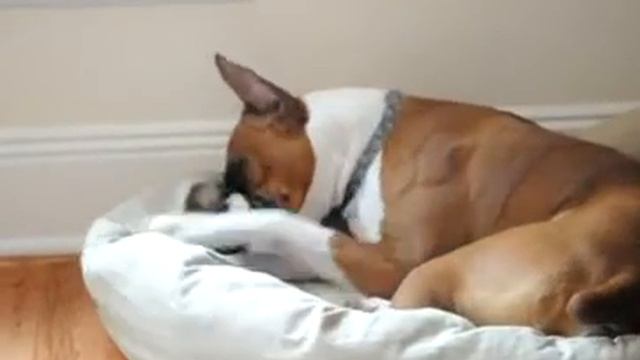 Немецкий боксер чихает. Молодой боксер с купированными ушами и хвостом, размером с маленького жеребенка лежит на своем спальном месте и чихает. Чихает интересно. Не слышно громких звуков, типа апчхи, нет, он просто шумно выдыхает воздух, как будто фыркает. Видно как он морщит морду с правой стороны, и прищуривает правый глаз, наверное раздражение в правой ноздре. После очередного чиха пес посмотрел на хозяина исподлобья грустными глазами, дескать, вот ведь, со мной какая вышла незадача. Какой красноречивый взгляд! Потихоньку приступ чиханья пошел на убыль, пес стал зевать и укладываться поудобнее изредка чихая, но уже не так сильно как вначале. Смотрите забавное видео с чихающим немецким боксером! https://youtu.be/-4_H08cRjVk Данное видео вошло в подборку СМЕШНЫЕ ЖИВОТНЫЕ ИКАЮТ И ЧИХАЮТ 2 https://youtu.be/8cKr1y2-chA