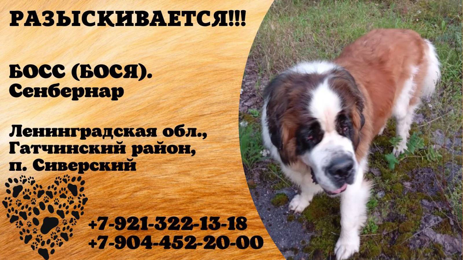 Ленинградская Гатчинский район, п. Сиверский Пропала собака БОСЯ ПРОПАЛ( 21.09.24 гуляли в районе аэродрома поселка Сиверский. Его видели на трассе в районе поселка Куровицы. ДОРОГИЕ ДРУЗЬЯ, ЕСЛИ ВАМ НЕ СЛОЖНО, РАЗМЕСТИТЕ ЭТО ОБЪЯВЛЕНИЕ У СЕБЯ! Особенности Босса – порода сенбернар, он ласковый, как телёнок, и очень доверчивый, всех любит, всем рад, пойдёт с любым. ДРУЗЬЯ – ВСЯ НАДЕЖДА НА ВАШИ РЕПОСТЫ. Может кто-то видел пса, или объявление о находке доброго сенбернара в том районе. Хозяева ищут его уже пять дней, но пока безрезультатно Телефон хозяйки: 8 921 322-13-18 На всякий случай, телефон передержки, где он жил: 904 452-20-00 Инфо: https://vk.com/wall-198815410_154455 Автор: https://vk.com/id710588252