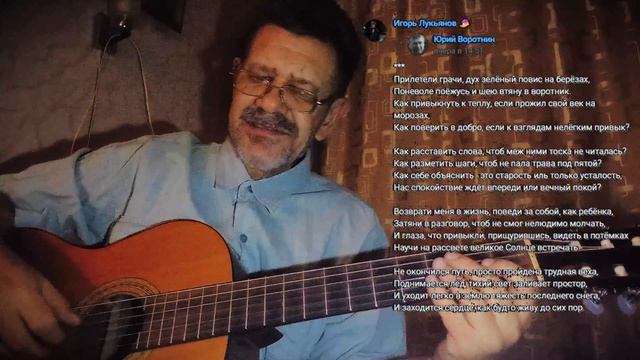 Юрий Воротнин *** Прилетели грачи, дух зелёный повис на берёзах, Поневоле поёжусь и шею втяну в воротник. Как привыкнуть к теплу, если прожил свой век на морозах, Как поверить в добро, если к взглядам нелёгким привык? Как расставить слова, чтоб меж ними тоска не читалась? Как разметить шаги, чтоб не пала трава под пятой? Как себе объяснить - это старость иль только усталость, Нас спокойствие ждёт впереди или вечный покой? Возврати меня в жизнь, поведи за собой, как ребёнка, Затяни в разговор, чтоб не смог нелюдимо молчать, И глаза, что привыкли, прищурившись, видеть в потёмках Научи на рассвете великое Солнце встречать. Не окончился путь, просто пройдена трудная веха, Поднимается лёд, тихий свет заливает простор, И уходит легко в землю тяжесть последнего снега, И заходится сердце, как будто живу до сих пор. https://vk.com/wall708582855_9583