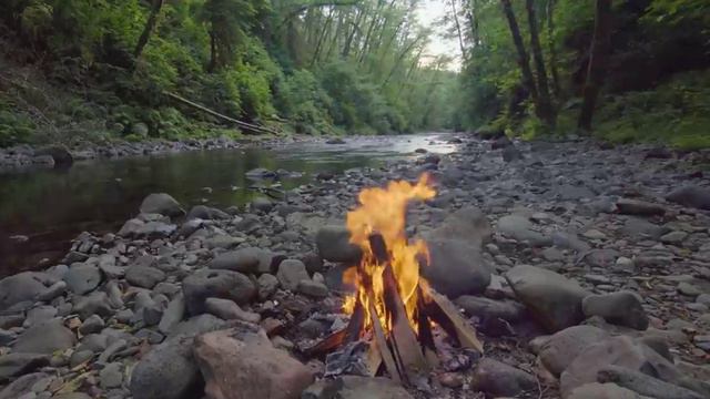Потрескивание костра под расслабляющие звуки реки и чудесное пение птиц.