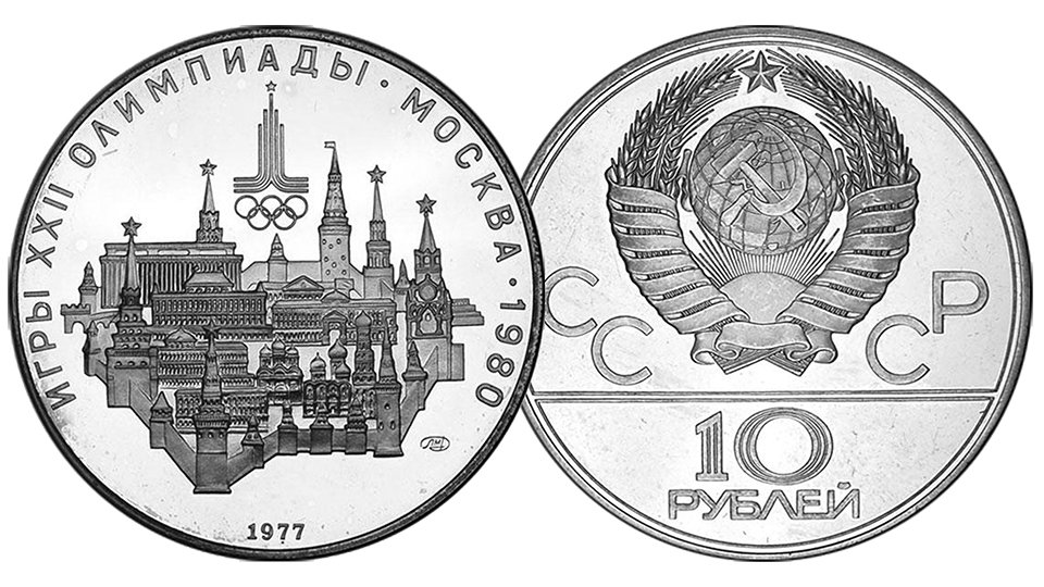 Серебряные 10 рублей к Олимпиаде 1980 года в Москве. Московский кремль.