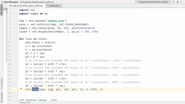 code - https://gist.github.com/pknowledge/62ad0d100d6d4df756c0374dee501131 In this video on OpenCV Python Tutorial For Beginners, we are going to see Hough Line Transform using HoughLines method in OpenCV. OpenCV implements two kind of Hough Line Transforms The Standard Hough Transform (HoughLines method) The Probabilistic Hough Line Transform (HoughLinesP method) lines = cv.HoughLines(image, rho, theta, threshold) image : source image. lines : Output vector of lines. Each line is represented by a 2 or 3 element vector (ρ,θ) or (ρ,θ,votes) . ρ is the distance from the coordinate origin (0,0) (top-left corner of the image). θ is the line rotation angle in radians . votes is the value of accumulator. rho : Distance resolution of the accumulator in pixels. theta : Angle resolution of the accumulator in radians. threshold : Accumulator threshold parameter. Only those lines are returned that get enough votes ( greater then threshold ). OpenCV is an image processing library created by Intel and later supported by Willow Garage and now maintained by Itseez. opencv is available on Mac, Windows, Linux. Works in C, C++, and Python. it is Open Source and free. opencv is easy to use and install. Starting with an overview of what the course will be covering, we move on to discussing morphological operations and practically learn how they work on images. We will then learn contrast enhancement using equalization and contrast limiting. Finally we will learn 3 methods to subtract the background from the video and implement them using OpenCV. At the end of this course, you will have a firm grasp of Computer Vision techniques using OpenCV libraries. This course will be your gateway to the world of data science. Feel the real power of Python and programming! The course offers you a unique approach of learning how to code by solving real world problems. References: https://docs.opencv.org/2.4/doc/tutorials/imgproc/imgtrans/hough_lines/hough_lines.html https://docs.opencv.org/4.0.0/d6/d10/tutorial_py_houghlines.html http://aishack.in/tutorials/hough-transform-basics/ https://en.wikipedia.org/wiki/Hough_transform #ProgrammingKnowledge #ComputerVision #OpenCV ★★★Top Online Courses From ProgrammingKnowledge ★★★ Python Programming Course ➡️ http://bit.ly/2vsuMaS ⚫️ http://bit.ly/2GOaeQB Java Programming Course ➡️ http://bit.ly/2GEfQMf ⚫️ http://bit.ly/2Vvjy4a Bash Shell Scripting Course ➡️ http://bit.ly/2DBVF0C ⚫️ http://bit.ly/2UM06vF Linux Command Line Tutorials ➡️ http://bit.ly/2IXuil0 ⚫️ http://bit.ly/2IXukt8 C Programming Course ➡️ http://bit.ly/2GQCiD1 ⚫️ http://bit.ly/2ZGN6ej C++ Programming Course ➡️ http://bit.ly/2V4oEVJ ⚫️ http://bit.ly/2XMvqMs PHP Programming Course ➡️ http://bit.ly/2XP71WH ⚫️ http://bit.ly/2vs3od6 Android Development Course ➡️ http://bit.ly/2UHih5H ⚫️ http://bit.ly/2IMhVci C# Programming Course ➡️ http://bit.ly/2Vr7HEl ⚫️ http://bit.ly/2W6RXTU JavaFx Programming Course ➡️ http://bit.ly/2XMvZWA ⚫️ http://bit.ly/2V2CoAi NodeJs Programming Course ➡️ http://bit.ly/2GPg7gA ⚫️ http://bit.ly/2GQYTQ2 Jenkins Course For Developers and DevOps ➡️ http://bit.ly/2Wd4l4W ⚫️ http://bit.ly/2J1B1ug Scala Programming Tutorial Course ➡️ http://bit.ly/2PysyA4 ⚫️ http://bit.ly/2PCaVj2 Bootstrap Responsive Web Design Tutorial ➡️ http://bit.ly/2DFQ2yC ⚫️ http://bit.ly/2VoJWwH MongoDB Tutorial Course ➡️ http://bit.ly/2LaCJfP ⚫️ http://bit.ly/2WaI7Ap QT C++ GUI Tutorial For Beginners ➡️ http://bit.ly/2vwqHSZ ★★★ Online Courses to learn ★★★ Get 2 FREE Months of Unlimited Classes from skillshare - https://skillshare.eqcm.net/r1KEj Data Science - http://bit.ly/2lD9h5L | http://bit.ly/2lI8wIl Machine Learning - http://bit.ly/2WGGQpb | http://bit.ly/2GghLXX Artificial Intelligence - http://bit.ly/2lYqaYx | http://bit.ly/2NmaPya MERN Stack E-Degree Program - http://bit.ly/2kx2NFe | http://bit.ly/2lWj4no DevOps E-degree - http://bit.ly/2k1PwUQ | http://bit.ly/2k8Ypfy Data Analytics with R - http://bit.ly/2lBKqz8 | http://bit.ly/2lAjos3 AWS Certification Training - http://bit.ly/2kmLtTu | http://bit.ly/2lAkQL1 Projects in Java - http://bit.ly/2kzn25d | http://bit.ly/2lBMffs Machine Learning With TensorFlow - http://bit.ly/2m1z3AF | http://bit.ly/2lBMhnA Angular 8 - Complete Essential Guide - http://bit.ly/2lYvYRP Kotlin Android Development Masterclass - http://bit.ly/2GcblsI Learn iOS Programming Building Advance Projects - http://bit.ly/2kyX7ue ★★★ Follow ★★★ My Website - http://www.codebind.com DISCLAIMER: This video and description contains affiliate links, which means that if you click on one of the product links, I’ll receive a small commission. This help support the channel and allows us to continue to make videos like this. Thank you for the support!