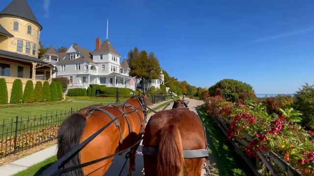 Осенняя поездка на карете на острове Макинак | Успокаивающий стук лошадиных копыт на тихой природной тропе. Наслаждайтесь осенней поездкой в карете на острове Макинак, штат Мичиган. Послушайте успокаивающий стук лошадиных копыт и окружающие звуки природы, пока они идут от ресторана Woods до курорта Mission Point. Цвета осени только начинают меняться, а внутренняя часть острова представляет собой спокойную и умиротворенную территорию, которую мало кто исследует!