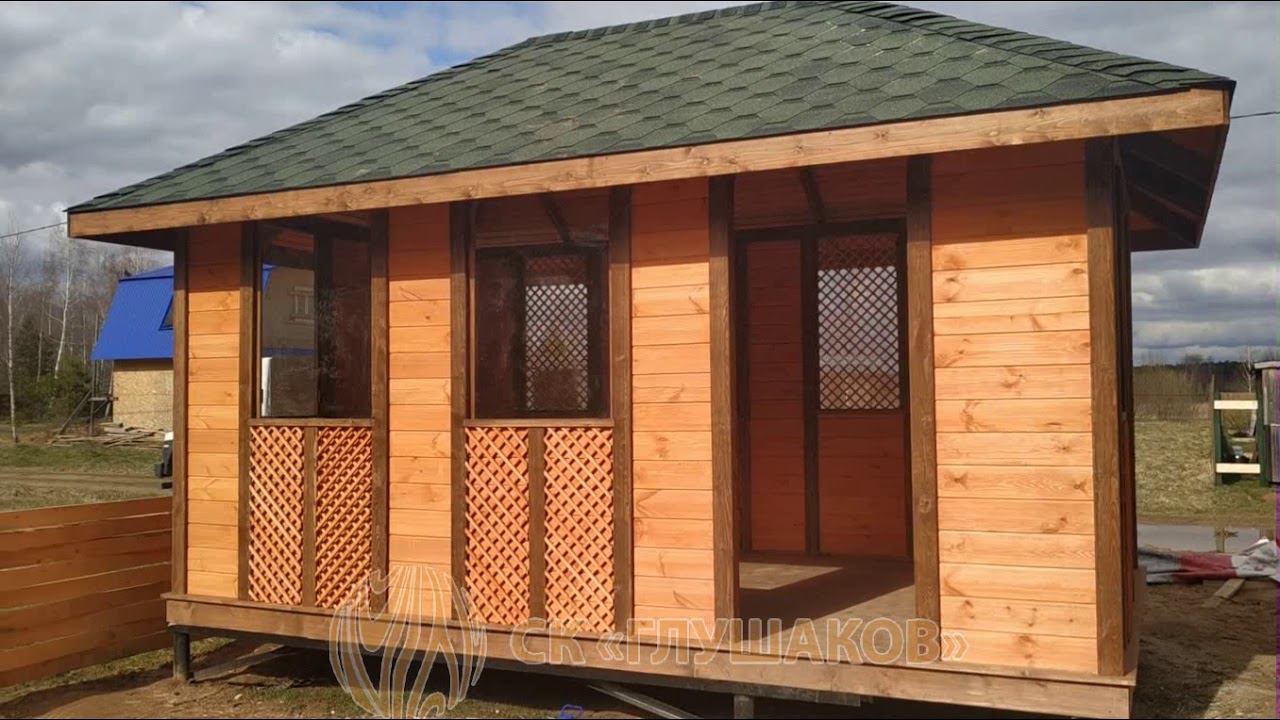 Готовая деревянная беседка со съемными стеклами, вариант спроектирован самим заказчиком, его пожелания воплощены в жизнь. Сайт https://baniglushakova.ru/katalog/besedki/