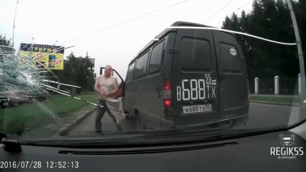 28.07.2016. Омск.Мужчина за рулём ГАЗели подрезал, автора видео, за что получил порцию слезоточивого газа в глаза, но это его не остановило, он отомстил, разбив ключом лобовое стекло, нашему очевидцу.