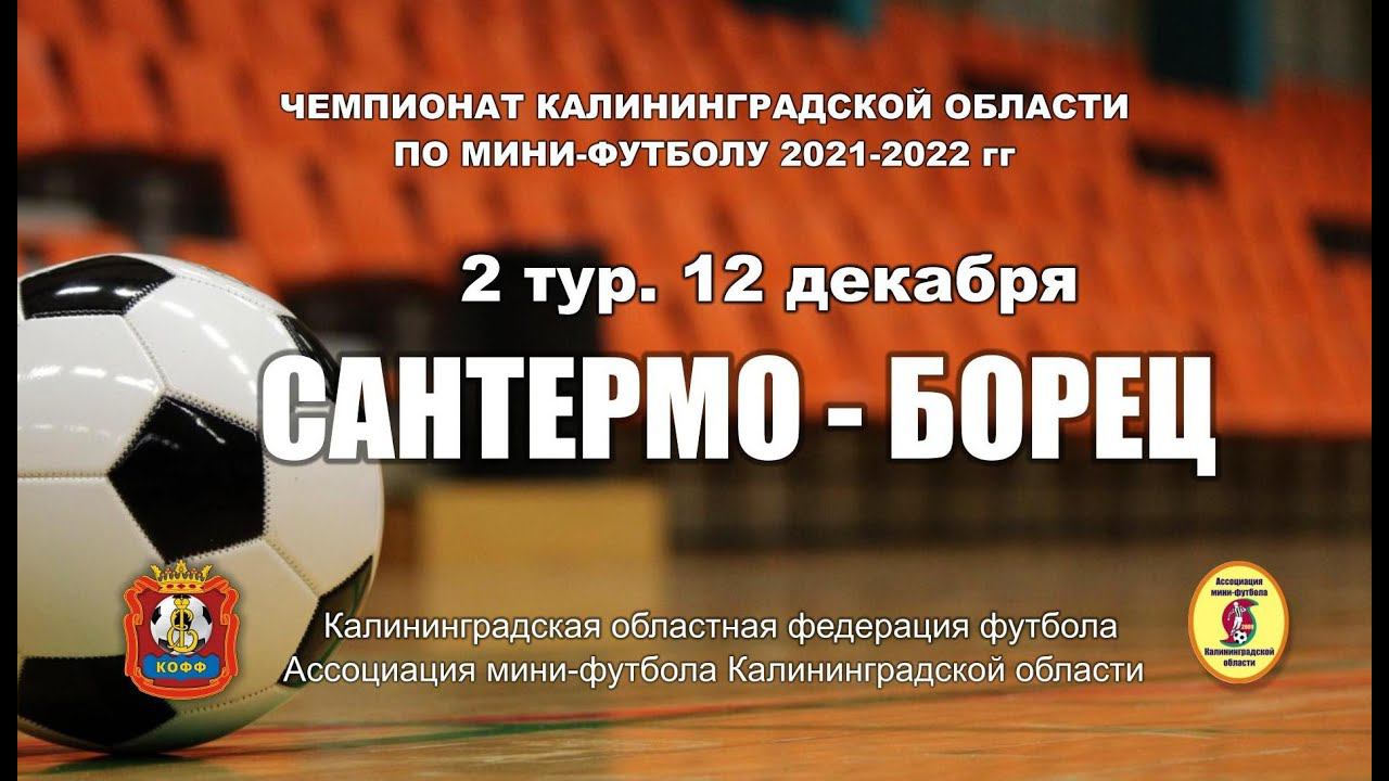 12.12.21. Мини-футбол. Чемпионат Калининградской области. Суперлига. 2-й тур. «СанТермо» - «Борец» 5:1 (2:0) Голы забили: А.Жаринов (11'), Д.Сасковец (13'), А.Можаровский (24'), Е.Афонин (26'), В.Вишняков (29') -- А.Хрипунков (40') Предупреждены: К.Трацевич (Б), А.Хрипунков (Б), А.Сульдин (С), О.Стадухин (С) Удалены: нет
