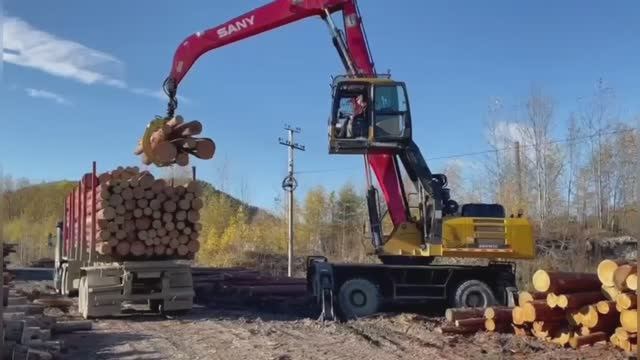 Перегружатель SANY SMHW 30 работает с грейфером для лесоматериалов