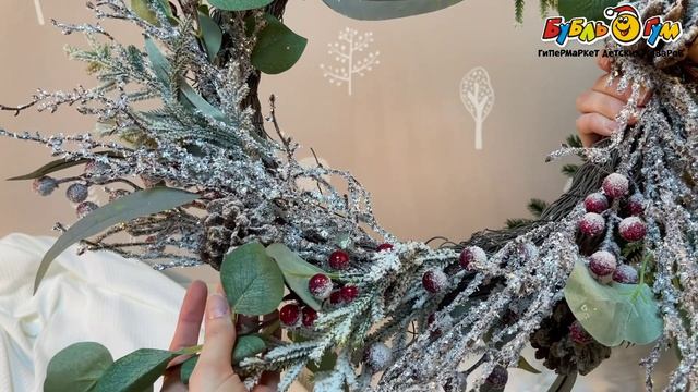 332422 Украшение декоративное Венок хвойный с шишками и ягодами и серебристым напылением 45см