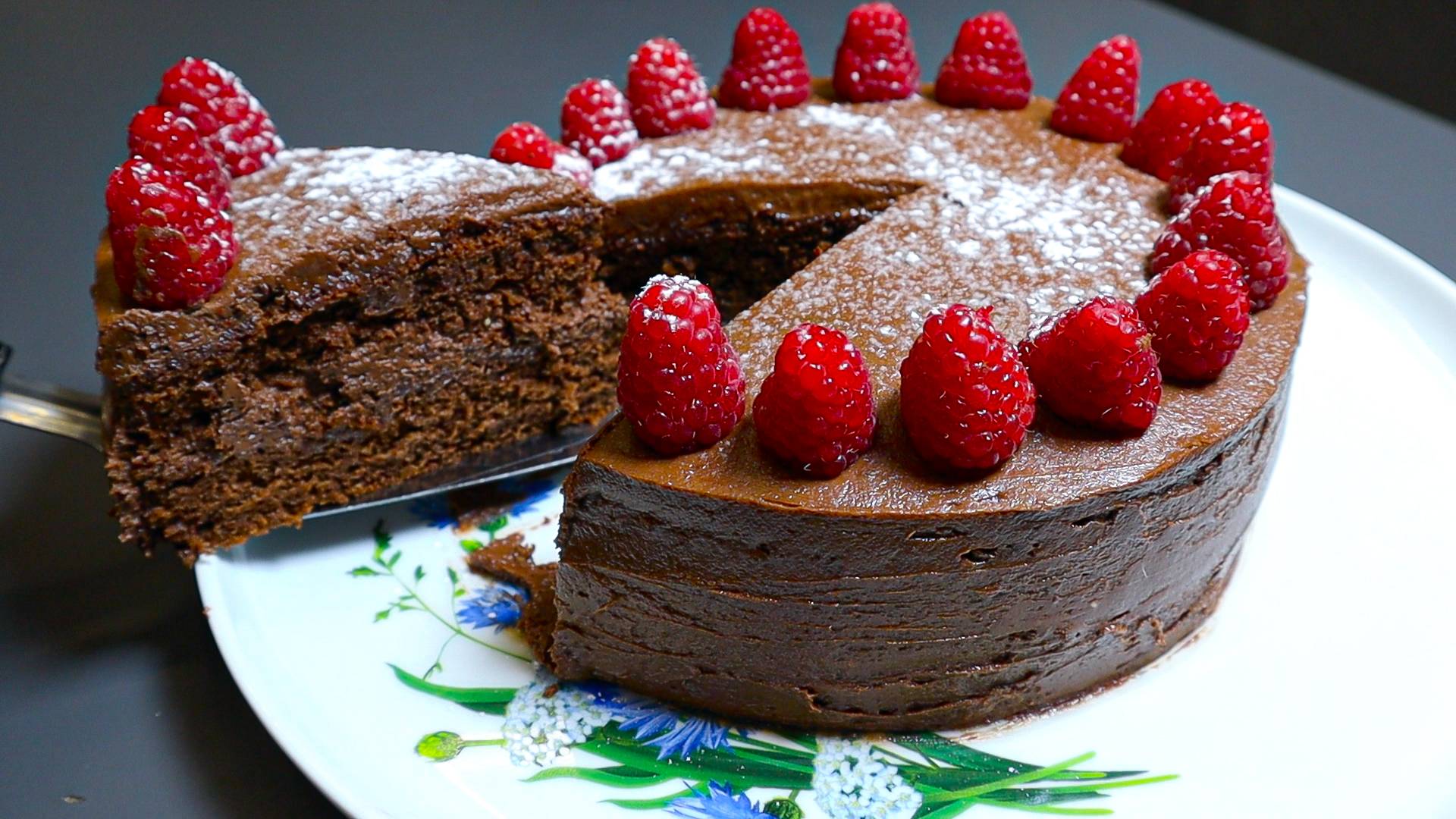 Добрый день! Сегодня приготовим обалденно вкусный шоколадный торт с малиной. Простой Рецепт вкусного шоколадного торта. Вкусный десерт к чаю. - яйца 2 шт. - сахар 120 г. - растительное масло 40 мл. - тёплая вода 70 мл. - мука 90 г. + разрыхлитель 7 г. - какао 20 г. - форма для выпечки 18 см. - в духовку на 35 минут при 180 °C. - сливочное масло 65 г. + сахарная пудра 40 г. - сливочный сыр 200 г. - темный шоколад 54% 120 г. - украшаем малиной. - немного сахарной пудры. Наш шоколадный торт готов! Если понравилось поставьте лайк, подпишитесь и напишите комментарий!