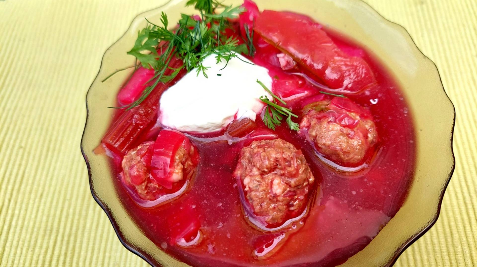 Такой борщ можно приготовить только в сезон первых летних овощей. Начинают наливаться корнеплоды – они такие ароматные, яркие, сочные. В ход идёт всё – черенки, ботва, не созревший горох, в сочных створках, маленькие луковички. Вкус детства, так готовила бабушка. ИНГРЕДИЕНТЫ: • Бульон – 1,3 л • Фарш домашний – 200 гр • Картофель – 2 шт • Свёкла – 3 шт • Морковь – 4 шт • Лук репчатый – 8 шт • Горох плюшки – 30 шт • Капуста белокочанная – 100 гр • Лук зелёный – 15 гр • Соль – 0,5 стл Дополнительно: • Сметана – кол -во по желанию При приготовлении борща рекомендую ориентироваться на предоставленную видеоинформацию, свой вкус и предпочтения. Готовьте с удовольствием, экспериментируйте, пробуйте! ПРИЯТНОГО АППЕТИТА!!! Всем мира, бодрости духа и благополучия!