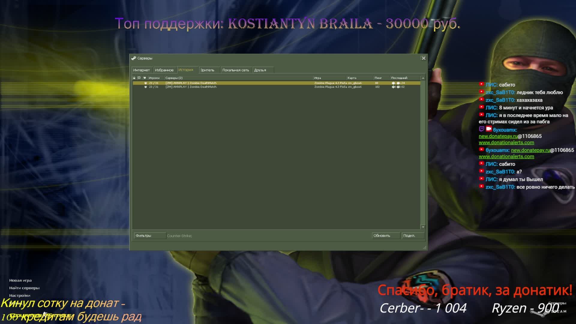 IP сервера: 45.136.204.170:27015 Поддержать канал: https://new.donatepay.ru/@1106865 https://www.donationalerts.com/r/6yxouamx Группа в ВК: https://vk.com/zombie_dm Телеграм: https://t.me/zombie_dm Discord: https://discord.gg/65cyh3zZmX Скачать КС 1.6: https://cs-all-servers.ru/download?id=14&type=direct&p=838 ПОИГРАТЬ НА СЕРВЕРЕ 1 КАРТУ - 100 РУБ СМЕНИТЬ КАРТУ: В ПЕРВОМ РАУНДЕ - 100 РУБ, ВО ВТОРОМ - 200 РУБ ПРОДЛИТЬ СТРИМ: НА 30 МИНУТ - 150 РУБ, НА 1 ЧАС - 400 РУБ ПОЛУЧАТЬ В ТЕЧЕНИЕ СТРИМА 100 КРЕДИТОВ КАЖДУЮ КАРТУ - 100 РУБЛЕЙ ОТВЕТ НА ЛИЧНЫЙ ВОПРОС (ВОЗРАСТ, ДЕТИ, РАБОТА И Т.П) - 1000 РУБЛЕЙ