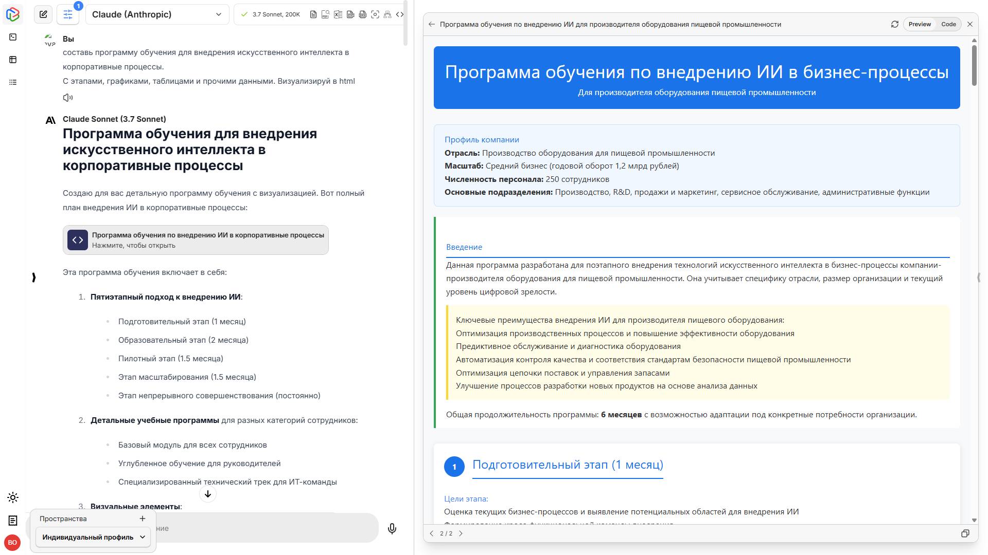 Каждому руководителю бизнеса периодически нужно проходить повышение квалификации, а также развивать компетенции и навыки своей команды. Можно потратить время и финансы компании на поиск узких специалистов и разработку методики обучения сотрудников. А можно воспользоваться сервисом VisGPT https://gpt.vis.center/, который удобен в использовании, всегда под рукой и заменит дорогих коучей или онлайн-курсы. Показываем, как можно создать программу обучения с помощью нейросети на примере производителя оборудования для пищевой промышленности среднего масштаба с годовым оборотом 1,2 млрд рублей и штатом в 250 сотрудников. Используемый промпт: составь программу обучения для [указать чего] внедрения искусственного интеллекта в корпоративные процессы для [указать кого]. С этапами, графиками, таблицами и необходимыми данными. Визуализируй в html. Спустя некоторое время Claude представил развернутую обучающую программу на шесть месяцев, учтя наш запрос и данные компании. Проведите цифровизацию с сервисом VisGPT https://gpt.vis.center/ — 50+ нейросетей для бизнеса в одном окне, с оплатой в рублях! Связаться с нами ai@vis.center 👈 Подробнее о VisGPT: https://ai.vis.center/ 🚀