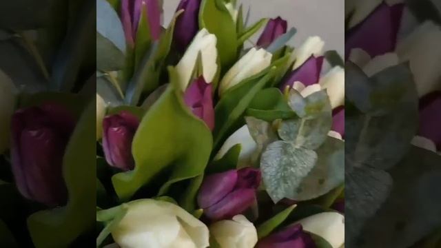 Микс белых и фиолетовых тюльпанов с эвкалиптом в коробке "Гармония стихий"