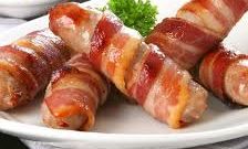 Молочная сосиска — 3-5 шт. Бекон — 6-8 ломтиков Моцарелла — 40 г Молодой картофель — 250 г Соль, черный перец, розмарин — по вкусу Оливковое масло — 2 ст. л. Помидоры черри — 1 веточка Приготовление: Картофель разрежьте пополам. Сбрызните маслом и приправьте. Запекайте в разогретой до 190 °C духовке до готовности. Нарежьте моцареллу. Надрежьте сосиски. Поместите внутрь сыр. Оберните сосиски беконом. Запекайте до румяной корочки. Подавайте с картофелем, украсив томатами.