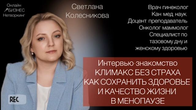 Светлана Колесникова - кандидат медицинских наук, врач гинеколог, онколог-маммолог, доцент кафедры, преподаватель, ученый-исследователь; Специалист по тазовому дну и по женскому здоровью после менопаузы с опытом практической деятельности более 20 лет. Имеет 2 авторских свидетельства на изобретения  и является автром и соавтором более 50 научных работ. 🌟 Более 18 лет занимается проблемой опущения и выпадения тазовых органов, а также недержания мочи; Владеет полным спектром диагностики и лечения опущения тазовых органов 🌟 Член международного общества по менопаузе и эксперт по женскому здоровью после менопаузы, гинеколог - эндокринолог; 🌟 Так как является практикующим врачом-маммологом, разрабатывает индивидуальную программу профилактики рака молочных желез для каждой женщины; 🌟 Осуществляет наблюдение и ведение пациенток после лечения онкологии. ✈️ Контакты и социальные сети: Telegram https://t.me/doctorksn @doctor.ksn YouTube https://youtube.com/@doctorksn?si=hQr1XtQ1s7qMaVjL https://vk.com/doctorksn @doctorksn1 🎤✨ По вопросам участия в качестве спикера в подкастах интервью, а также различных других форматах (индивидуальный эфир, практикум, конференция, нетворкинг) обращайтесь к организатору в Телеграмм https://t.me/Albina_biz https://t.me/biz_networking1 - Telegram https://vkvideo.ru/@online_business_networking ВК Видео https://www.youtube.com/@online_business_networking - YouTube https://dzen.ru/online_business_networking - Яндекс Дзен https://rutube.ru/channel/30460363/ - RuTube #ОнлайнНетворкинг #УчастиеВмарафоне #СпикерНетворкинг #УчастиеВнетворкинге #Гинеколог