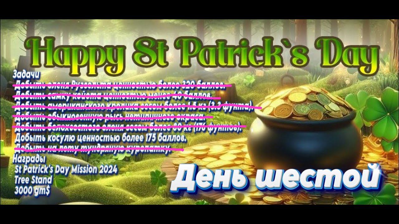 Задачи Добыть косулю ценностью более 175 баллов. Награды St Patrick's Day Mission 2024 Tree Stand 3000 gm$ *** Розыгрыши проходят на канале Трово. Ссылка ниже. *** Группа в ВК - https://vk.com/weimoor Дискорд для общения с единомышленниками - https://discord.com/invite/YFYRYhRkYh Для просмотра на Трово https://trovo.live/s/Weimoor Помощь стримеру https://www.donationalerts.com/r/weimoor Реферальная ссылка TheHunter Classic для получения бонусных вещей https://signup.thehunter.com?ref=weimoor Пригласительная ссылка на ТГ канал https://t.me/+aH8YtNfb5KJiOWQy