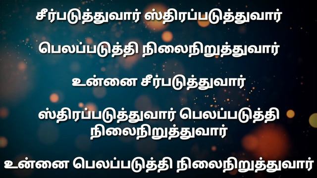 For wats app status video click below link https://youtu.be/0wuUFL3Rtc8 Please support us by subscription & sharing videos to friends....... இடம் கொள்ளாமல் பெருகச்செய்யும் தேவன் உன்னை இல்லாமல் செய்வேன் என்று சொன்னோர் முன் இடம் கொள்ளாமல் பெருகச்செய்யும் தேவன் நேராகும் வாய்ப்பில்லா உன் வாழ்வை சீராக மாற்றிட வருவாரே சீர்படுத்துவார் ஸ்திரப்படுத்துவார் பெலப்படுத்தி நிலைநிறுத்துவார் உன்னை சீர்படுத்துவார் ஸ்திரப்படுத்துவார் பெலப்படுத்தி நிலைநிறுத்துவார் உன்னை பெலப்படுத்தி நிலைநிறுத்துவார் 1) கொஞ்சகாலம் கண்ட பாடுகள் எல்லாமே பனிபோல உந்தன் முன்னே உருகிப்போகும் கொஞ்சகாலம் கண்ட பாடுகள் எல்லாமே பனிபோல உந்தன் முன்னே உருகிப்போகும் உன் கஷ்டங்கள் நஷ்டங்கள் எல்லாமே மாறும் உன் கஷ்டங்கள் நஷ்டங்கள் எல்லாமே மாறும் புது நன்மைகள் உன்னை சேரும் 2) மேன்மையை தடுக்க நின்ற கூட்டங்கள் எல்லாமே தேவன் உன் கூட என்று வணங்கி நிற்கும் மேன்மையை தடுக்க நின்ற கூட்டங்கள் எல்லாமே தேவன் உன் கூட என்று வணங்கி நிற்கும் உனை பகைத்தவர் தந்திட்ட காயங்கள் மாறும் உனை பகைத்தவர் தந்திட்ட காயங்கள் மாறும் உன் மேன்மை உன் கையில் சேரும் Pas. Gersson Edinbaro, Pas. Alwin Thomas, Pas. John Jebaraj, Bro. Samuel Dhinakaran, Bro. Benny Joshua, Sis. Stella Romola, Sis. Cherie Mitchelle
