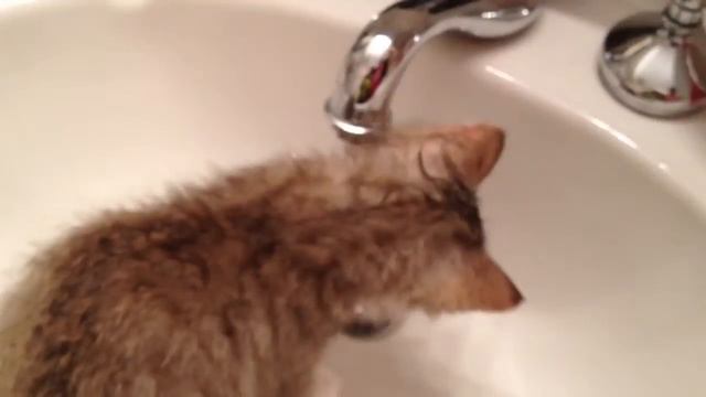 Munchkin kitty in water
