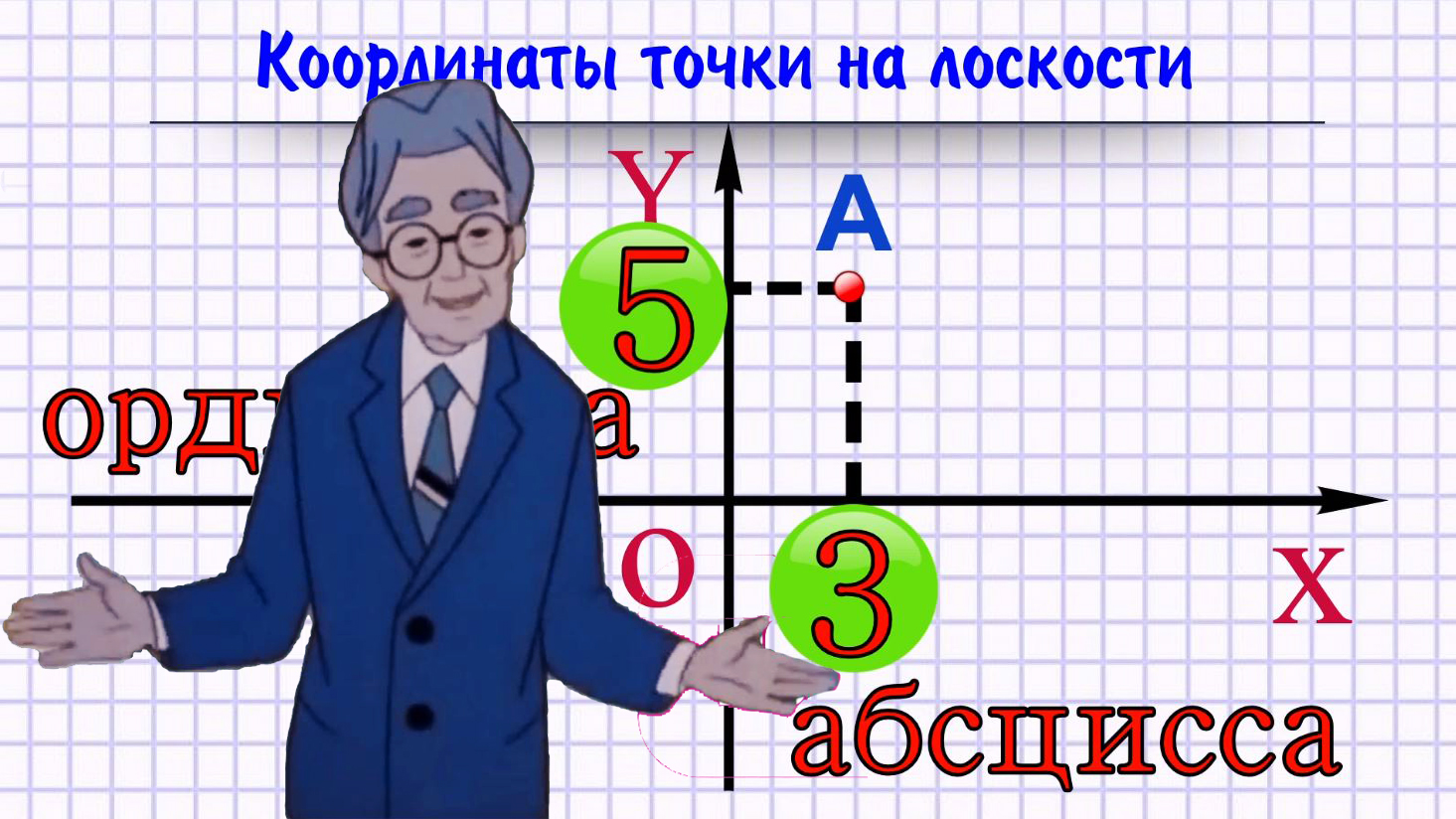 Если взять на координатной плоскости произвольную точку A и провести от неё перпендикуляры к осям координат, то основания перпендикуляров лягут на два числа. Число, на которое указывает вертикальный перпендикуляр, называется абсциссой точки A. Число, на которое указывает горизонтальный перпендикуляр, — ординатой точки A.