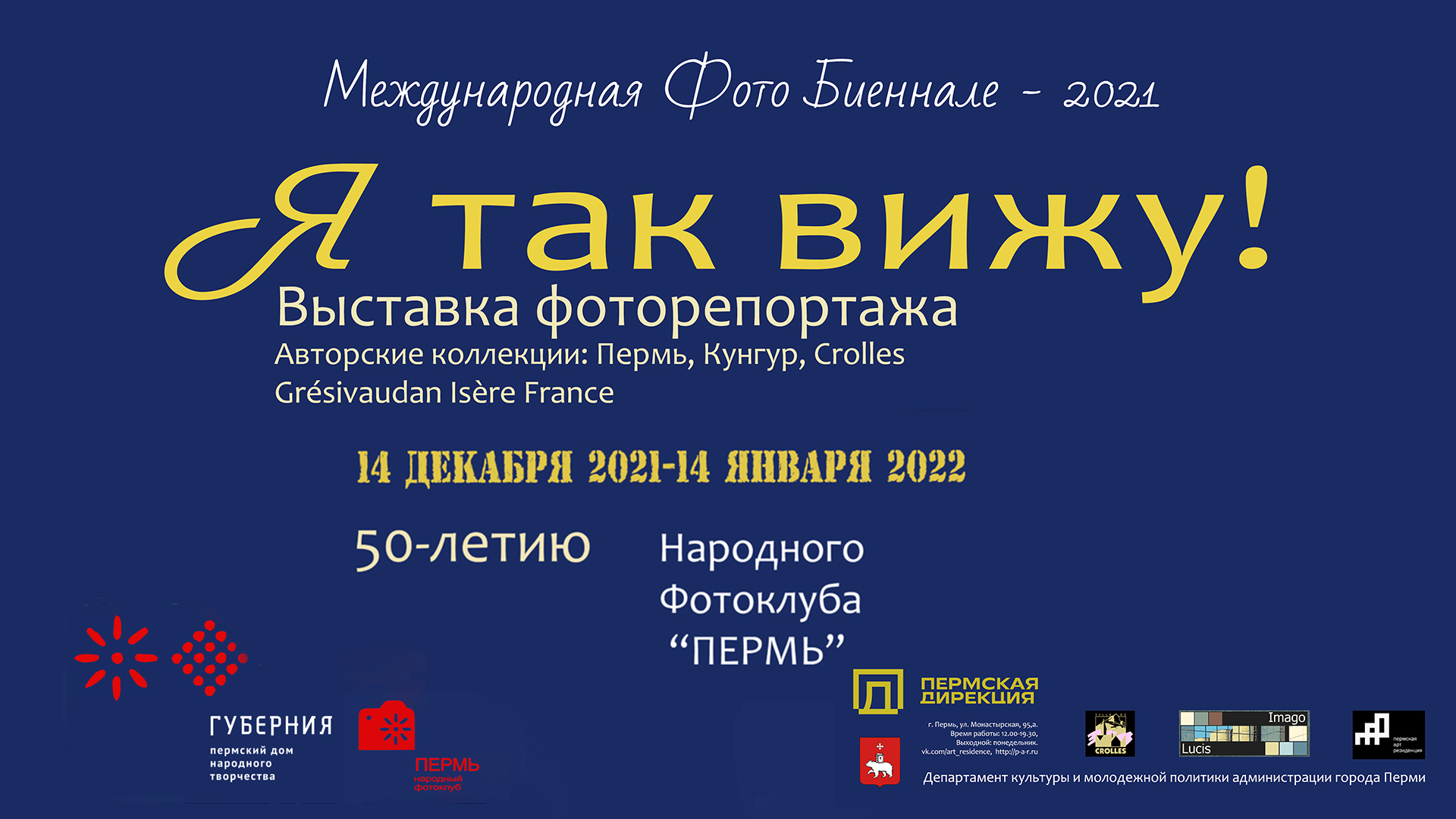 #фотоклубпермь50лет #ЮрийЛапшин #Международнаябиеннале #АлександрСумишевский #Пермь #ПДНТГуберния #фотовыставка #видеомонтажназаказ #народныйфотоклубПермь Проект Народного Фотоклуба «Пермь» (ПДНТ «Губерния») посвящён 50-летию коллектива фотохудожников. 14 декабря 2021года в Пермской Арт-резиденция открылась выставка Международной биеннале-2021 «Я так вижу». В экспозиции проекта представлено 130 фотографий из 34 авторских коллекций. На открытии выставки незабываемую атмосферу создал своим музыкальным выступлением Александр Сумишевский. На черно-белых и цветных фотографиях авторов из России (Перми, Кунгура) и Франции (Crolles, Grésivaudan, Isère), отражена повседневная жизнь горожан. Жизнь города и провинции без прикрас, с большими и маленькими печалями и радостями. Герои сюжетов - уличные музыканты, садовники, торговцы, обычные прохожие, здесь можно найти серьёзные, смешные, трогательные сцены из жизни. В проекте представлены работы французских аналоговых фотографов “Imago Lucis” Atelier photographique associatif - Crolles, Grésivaudan, Isère, France: ARNAUD FONTAINE, JEAN BÉREZNÉ, GILLES MAZEN, BENOIT CAPPONI, TIM WAlKER. «Очень радует, что на конкурс биеннале-2021 «Я так вижу!» прислали свои репортажные истории как постоянные авторы проектов НФК «Пермь», так и новые члены клуба - Евгения Лацис, Виктор Михалев, Иван Вострецов, Светлана Бакулина. Их работы так же вошли в экспозицию выставки»,