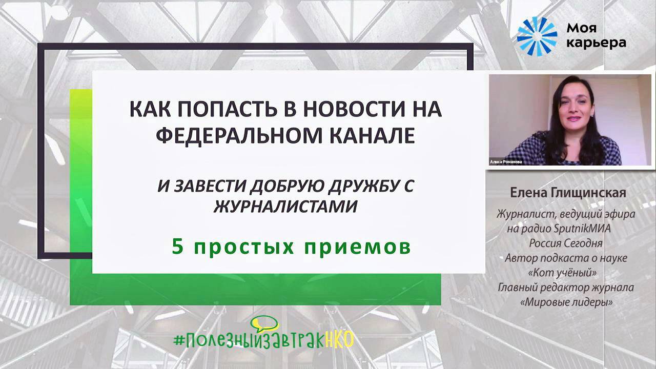 Как устроена редакция? Какая нужна информация? Качество информации. Как подготовиться к интервью? Как рассказать о своих достижениях (инфоповод)? Как пригласить СМИ на мероприятие? И многое другое. Скачать презентацию: https://disk.yandex.ru/i/LtvXcj_tkqaD9w #ПолезныйзавтракНКО - это цикл коротких онлайн-встреч для представителей некоммерческих организаций. В компании интересных людей мы делимся полезными знаниями о возможностях профессионального и личностного развития. Модераторами встреч выступают лучшие тренеры и специалисты Центра «Моя карьера», приглашенные спикеры, а также сами представители НКО. Сайт: https://xn--b1aaixkdbbdsdikd4c.xn--80adxhks/nko Спикер вебинара: Елена Глищинская, журналист, ведущий эфира на радио Sputnik МИА Россия Сегодня, автор подкаста о науке «Кот учёный», главный редактор журнала «Мировые лидеры». Модератор: Мария Белогурова, ведущий эксперт центра занятости «Моя карьера» https://mycareer.moscow/#/applicant