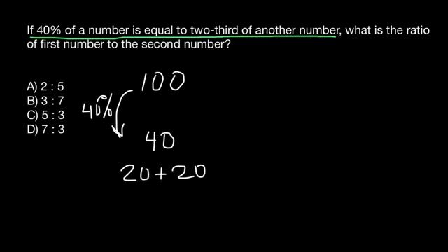 A ratio is an ordered pair of numbers a and b, written a / b where b does not equal 0. A proportion is an equation in which two ratios are set equal to each other. For example, if there is 1 boy and 3 girls you could write the ratio as: 1 : 3 (for every one boy there are 3 girls) 1 / 4 are boys and 3 / 4 are girls. If 40% of a number is equal to two-third of another number, what is the ratio of first number to the second number? A) 2 : 5 B) 3 : 7 C) 5 : 3 D) 7 : 3 #ratio #proportion #math https://www.youtube.com/watch?v=YOfASYdaS2U