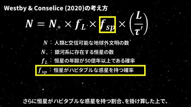 2020年6月10日に天文学の専門誌で発表された論文が世界的に大きな話題となりました。この動画では、今回発表された論文の結論よりも、どういった考え方で地球外文明の数を予想していったのか、これまでの研究とはどう違うのか、この論文の方法論を解説します。 【目次】 0:00 世界を駆け巡ったニュース 0:36 ドレイクの式 1:22 方程式の問題点 1:52 重要な仮定 2:18 観測不可能な変数を消す 2:37 「仮定」のもとでの式変形 3:52 計算結果 4:31 さらなる仮定 5:08 あとがき 【紹介論文】 T. Westby & C.J. Conselice (2020) The Astrobiological Copernican Weak and Strong Limits for Intelligent Life. The Astrophysical Journal, 896:58 (18pp). https://doi.org/10.3847/1538-4357/ab8225 【画像素材】 SpaceEngine, Newsweek 【字幕全文】 「銀河系には36個の地球外文明が存在する可能性がある」 今年の6月10日に天文学の専門誌で発表された論文が 世界的に大きな話題となりました。 現時点で、私たちの地球以外に 生命は発見されていないので、 こういった予想をするためには、当然様々な仮定が入ってきます。 この動画では、今回発表された論文の結論よりも、 どういった考え方で地球外文明の数を予想していったのか、 これまでの研究とはどう違うのか、 この論文の方法論を皆さんと一緒に詳しく見ていきたいと思います。 まずスタートとなるのは1961年に発表されたドレイクの式です。 我々の銀河系に存在し 人類と交信可能な地球外文明の数をN個とすると、 銀河系の中で1年間に誕生する恒星の数、 一つの恒星が惑星系を持つ確率、 一つの惑星系の中で、ハビタブルな惑星の数、 ハビタブル惑星の中で、生命が発生する確率、 発生した生命が、知的生命体まで進化する確率、 知的生命体が、電波など地球と交信できる技術を持つ確率、 その地球外文明が存続する期間 を掛け算することで、最終的なNが求まります。 これらのパラメーターに妥当と考えられる数値を代入することで、 Nが10個という結論が得られました。 これが1961年までの理解です。 しかしこの式には一つ大きな問題があります。 「1年間に誕生する恒星の数」や 「恒星が惑星を持つ確率」などは観測によって求めることができます。 しかし「発生した生命が、知的生命体まで進化する確率」や 「知的生命体が、地球と交信できる技術を持つ確率」を 実際の観測から制約するのはほぼ不可能です。 そのため、これらのパラメーターを使わずに、 実際に観測によって求まるパラメーターだけで 地球外文明の数を推測する必要がありました。 今回紹介する論文では、一つ大きな仮定を置くことで、 この問題を「迂回」しています。 その仮定とは、「ハビタブルな惑星が50億年以上、 安定に存在することができたら、その惑星では 100%の確率で、生命が発生し、 100%の確率で、知的生命体まで進化し、 100%の確率で、地球と交信可能な技術も獲得する」 というものです。 これはものすごく大きな仮定です。 先ほどのドレイクの式に当てはめると、 ハビタブルな惑星が50億年以上存在するという条件のもとで、 fl, fi, fcを全て1とする、ということに相当します。 これによって、未知のパラメータを消すことができ、 文明の持続時間さえ除けば、 あとは観測可能な量になるというわけです。 今の考え方を、この論文では以下のような式に落とし込んでいます。 人類と交信可能な地球外文明の数をN個とすると、 銀河系の全ての恒星の数、 恒星の年齢が50億年以上である割合 さらに恒星がハビタブルな惑星を持つ割合、を掛け算した上で、 文明の持続時間に対して、 生命がハビタブルな惑星において進化するのに使える時間の割合、 を最終的にかけ合わせて算出することができます。 最初の3つのパラメーターはいいとして、 最後の割合は何を意図しているのでしょうか。 地球外文明が存在していたとしても、それが太古の昔だったり、 人類が絶滅した後の、はるか未来であったりすると、 我々とは交信できないので、意味がありません。 具体的に考えると例えば、 ハビタブルな惑星の平均的な年齢が60億年だった場合 最初の50億年間は文明が存在しない、という仮定を置いていたので 残りの10億年だけが、文明が存在可能な期間となります。 よって、例えば文明の持続時間が200年だとすると、 この両者の割合が、時間という観点から見た、 地球外文明との接触確率になります。 ここまでくれば後は、 観測量や理論的な推定値を粛々と代入するだけです。 実はもう気づいた方もいるかもしれませんが、 これだけではかなりの過剰見積もりになります。 この仮定のまま、観測値や推定値を代入すると、 銀河系には平均で400個から900個近い地球外文明が、 存在するという結果が得られます。 もしこれらの文明が銀河系全体で均等に分布した場合、 3000から4000光年おきに存在することになります。 じゃあなぜこんな大きな数字になったかというと、 最初に置いた仮定では、惑星の年齢が50億年以降であったら、 いつでも文明が発