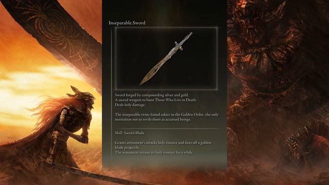 Elden Ring Narrated Compendium INSEPARABLE SWORD Sword forged by compounding silver and gold. A sacred weapon to hunt Those Who Live in Death. Deals holy damage. The inseparable twins found solace in the Golden Order, the only institution not to revile them as accursed beings. _______________ Skill: Sacred Blade Grants armament’s attack holy essence and fires off a golden blade projectile. The armament retains its holy essence for a while.