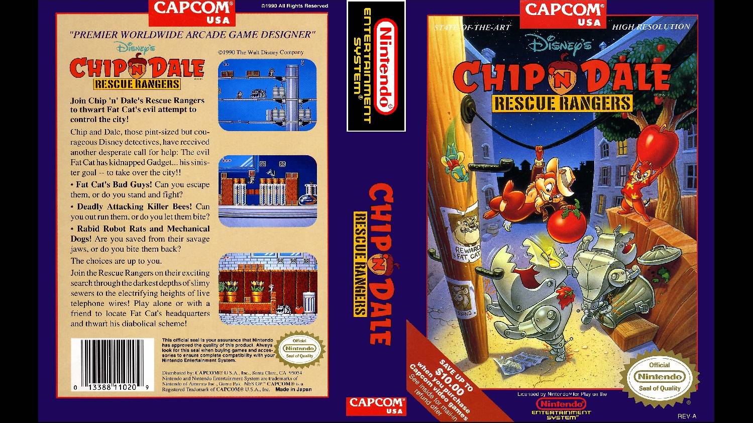 "CHIP 'N' DALE: RESCUE RANGERS" ("Чип и Дейл: спасатели спешат на помощь") - видеоигра по мотивам мультсериала студии "The Walt Disney Company", разработана компанией CAPCOM для консоли NES/Famicom в 1990 году. Игра имела коммерческий успех и разошлась тиражом в 1.2 миллиона копий по всему миру, став четвёртой самой продаваемой игрой компании на NES. Чип или Дейл (или оба сразу в режиме совместной игры двух игроков), спасатели-бурундуки, начинают спасательную операцию, цель которой - найти потерявшегося котёнка, и в ходе поисков обнаруживают себя вовлечёнными в интригу, подготовленную котом Толстопузом. Пытаясь вернуть похищенную им Гайку, Чип и Дейл заодно рушат его планы. Игра выполнена в жанре платформера с боковым (на некоторых уровнях вертикальным) скроллингом. Основным оружием бурундуков являются переносимые предметы, распределённые по игровым уровням: ящики, яблоки, гайки, брёвна и бомбы. Ящики могут содержать в себе различные бонусы, также их можно использовать как укрытие (но, в отличие от гаек, они ломаются при первом же удачном броске в противника). Во время игры вдвоём бурундуки могут переносить друг друга (обычно эта возможность используется, чтобы один игрок мог закинуть второго в секретное или труднодоступное место). Враги в игре разнообразны, каждый уровень характеризуется своим набором противников. Встречаются персонажи из мультсериала как в роли злодеев (механические собаки, инопланетяне, способные менять облик и т. д.), так и в роли неигровых персонажей (Рокки помогает преодолеть стены на бонусных уровнях, Вжик выполняет роль телохранителя, нейтрализуя всех противников, находящихся на экране). Игрокам также необходимо избегать различные препятствия и ловушки, такие как электрические разряды, гидравлические прессы, канцелярские кнопки и т. п. В конце большинства уровней игрока ожидает бой с промежуточным боссом, в финале игры состоится поединок с самим Толстопузом.