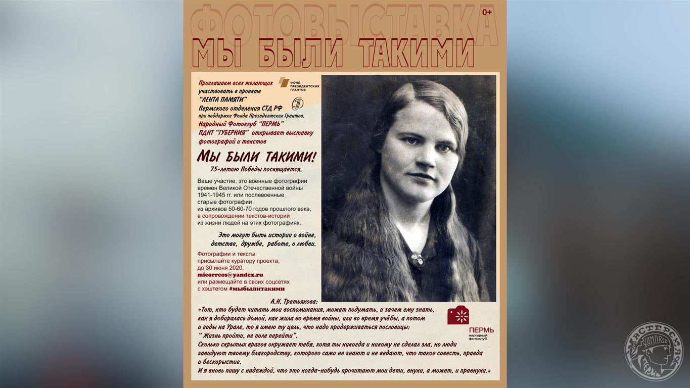 25 сентября 2020 года в Пермском Доме Актера состоялось открытие выставки "Мы были такими". На выставке представлены фотографии военных лет, а также фотографии 50-х, 60-х и 70-х годов из семейных архивов. Выставочная коллекция «Мы были такими», посвящена 75-летию Великой Победы. Фотохудожники дарили зрителям своё восхищение и уважение послевоенным поколениям. Участники выставки показали своими фотографиями раздумье и душевное понимание о том, что объединяло всех этих людей,чья активная часть жизни пришлась на 30-70-е годы 20-го века, какая сила давала им радость жизни.На выставке представлены уникальные фотографии, которые никогда ранее не выставлялись. Репортаж с открытия выставки и саму выставку представляем вашему вниманию.