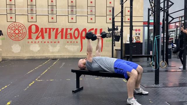 Жим гантелей лежа на скамье попеременно сверху-вниз прон.хватом