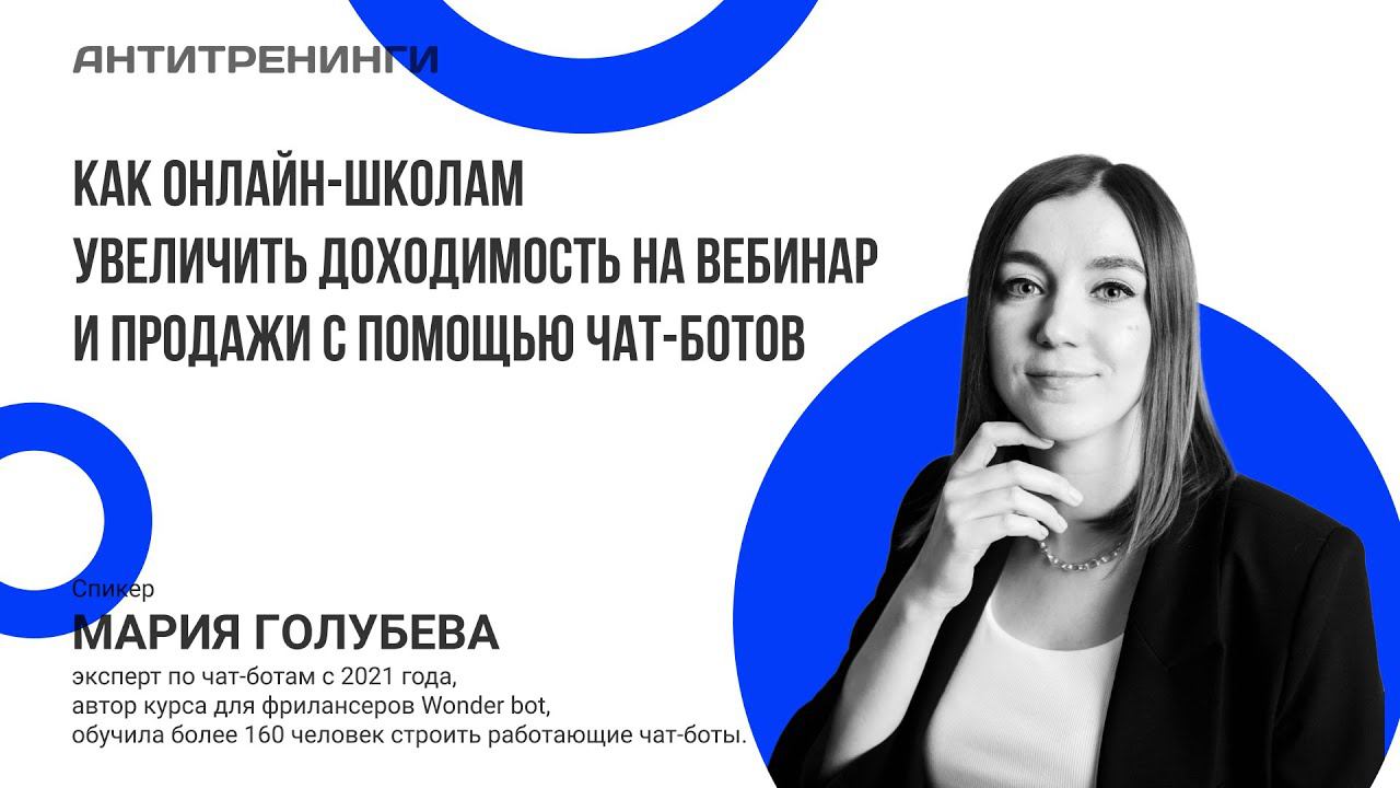 Вебинар на тему, как взять на работу чат-боты в свою онлайн-школу и что они умеют. В часовую беседу вместили пользы на пару часов. После просмотра вебинара вы сможете увеличить оборот проекта на 30% и более с помощью чат-ботов. Чат-боты – это инструмент, который автоматизирует ваш бизнес. Они могут отвечать на частые вопросы, прогревать клиента к покупке, приглашать на мероприятия, выдавать платный контент без вашего личного участия. ✅Кроме того, чат-боты – это база ваших клиентов, собранная в одном месте, где содержится, имя, ник в соц.сетях, e-mail и телефон (если эти данные вы запрашиваете), utm-метки для аналитики эффективности рекламных каналов. Что еще в записи❓: ✅Какие чат-боты работают в онлайн-школах; ✅С чего начать внедрение чат-ботов, если в вашем проекте их еще нет; ✅Почему у вас может быть низкая доходимость на вебинар, если со смыслами и аудиторией все хорошо; ✅Как внедрение чат-ботов в обучение повышает уровень доходимости онлайн-курса. Ведущий-эксперт: Мария Голубева, эксперт по чат-ботам с 2021 года, автор курса для фрилансеров Wonder bot, обучила более 160 человек строить работающие чат-боты. Переходите к просмотру видео, чтобы узнать, каку величить оборот проекта на 30% и более с помощью чат-ботов. Регистрируйтесь по ссылке https://billing.1iu.ru/promo/youtube-at и получайте 1 месяц доступа к платформе Антитренинги на профессиональном тарифе. Здесь можно разместить свои онлайн-курсы, обучать учеников, принимать платежи, настраивать геймификацию, кастомизировать онлайн-школу и личный кабинет, подключать интеграции и создать собственное мобильное приложение. Предложение действительно для новых авторов.