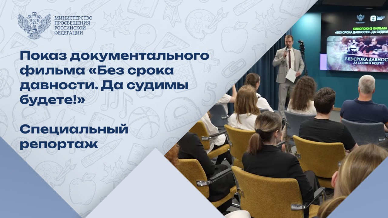 В преддверии Дня памяти и скорби в пресс-центре Минпросвещения России для школьников и студентов педвузов прошел показ документального фильма «Без срока давности. Да судимы будете!». Картина посвящена Новгородскому судебному процессу 1947 года. Специальными гостями встречи стали: режиссер фильмов цикла «Без срока давности» Илья Васильев, директор Центра кинопедагогики и медиакультуры МПГУ Иван Козлов и руководитель интернет-проекта «Вызывайте историка!» Андрей Котов. После просмотра фильма зрители обсудили значимость патриотического воспитания и сохранения исторической памяти. Показ стал совместным проектом Минпросвещения России и Российского общества «Знание».
