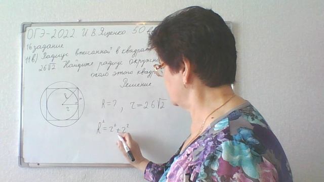 Решение задачи. Радиус вписанной в квадрат окружности равен 26(2)^(1/2). Найдите радиус окружности, описанной около этого квадрата. ОГЭ - 2022. И. В. Ященко. 50 вариантов. 16 задание, 11 вариант.
